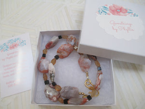 This one-of-a-kind necklace intermingles Jasper, Citrine and Black Spinel beads with warm summer hues - a perfect accent piece for your fall wardrobe. The necklace measures 16" and features a a gold clasp for closure.